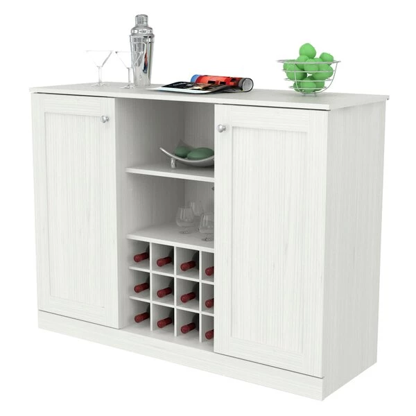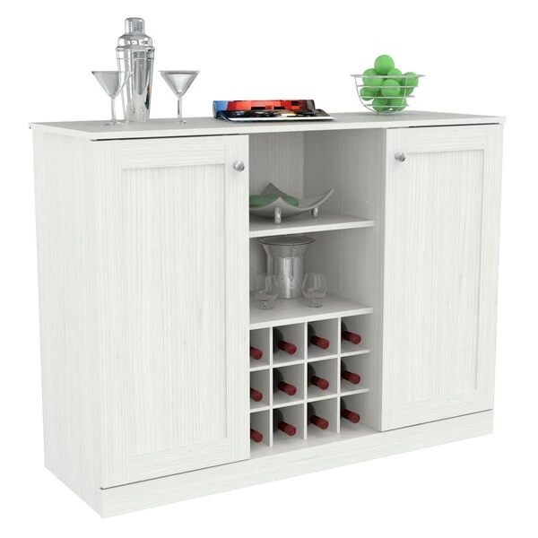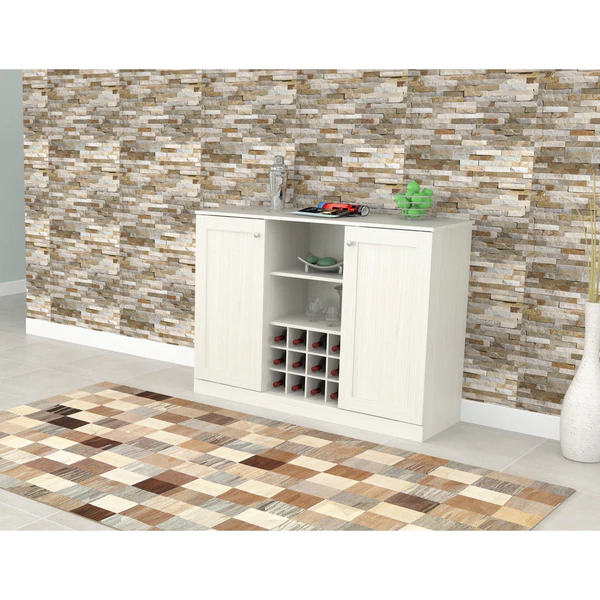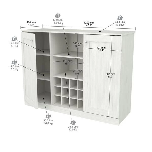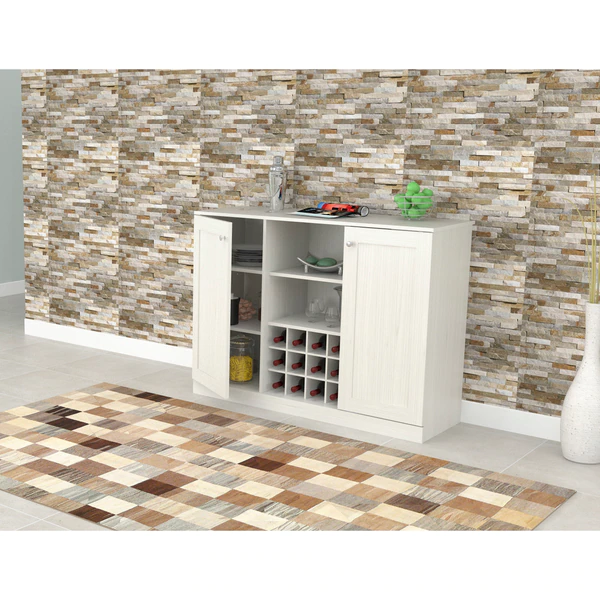 Shaker Style Buffet Cabinet by Inval® finished in a rich “Washed Oak” laminate with durable melamine which is stain, heat and scratch resistant. It is constructed from manufactured wood and features a functional modern design that is an excellent choice for your home. It includes two (2) doors featuring European style concealed hinges and embellished with brushed metal handles. Interior adjustable shelves offer ample storage space. The center features a wine rack that can accommodate up to twelve (12) standard size bottles with top shelves for your glasses, ice bucket and other entertainment accessories. This cabinet is just the right size to provide excellent storage and blend right in with your current décor. Anti-tip hardware is included. Assembly is required.