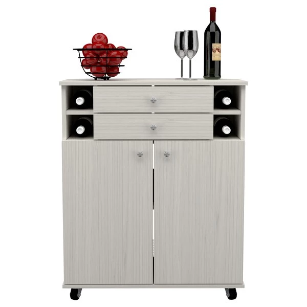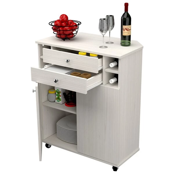 Multi-functional Corner Cabinet/Buffet by Inval® finished in a rich "Washed Oak" laminate. This unit has a modern fine quality appearance, that will inspire your home décor. It features four (4) built in slots for storing bottles horizontally. Two (2) handy drawers provide extra storage to help you keep tidy and organized. Two (2) doors conceal a large storage area with 2 shelves, 1 that is height adjustable to accommodate various items. Ample open storage is available on the top of the cabinet which is very convenient for displaying any type of decor. Constructed from manufactured wood laminated on both sides with durable melamine which is stain, heat and scratch resistan