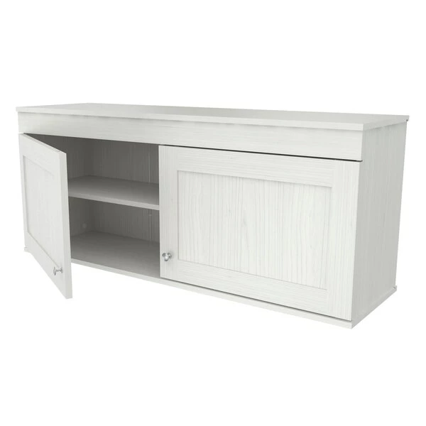 Shaker Style Buffet Cabinet by Inval® finished in a rich “Washed Oak” laminate with durable melamine which is stain, heat and scratch resistant. It is constructed from manufactured wood and features a functional modern design that is an excellent choice for your home. It includes two (2) doors featuring European style concealed hinges and embellished with brushed metal knobs. An interior shelf offers ample storage space. This cabinet is just the right size to provide additional storage and blend right in with your current décor. Assembly is required.