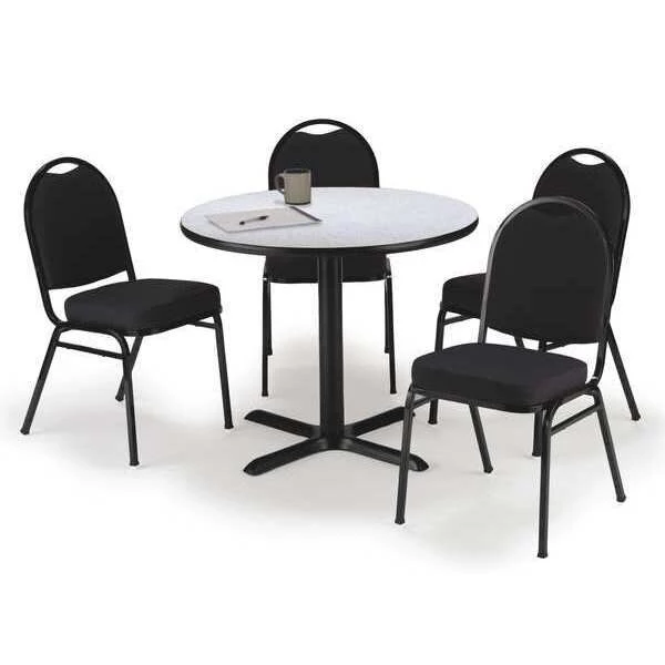 Durable and Economical Hospitality Furniture – Table & 4 chair set. The 36" Round table is 1.25" thick with a High Pressure Laminate surface and T-Mold edge. The base is made of durable cast iron. The column is 16 Gauge steel with a 3" diameter. Leveling glides for stability on uneven floors. The chairs are made with a 2" Cushioned seat for lasting comfort. Upholstered in durable fabric. The frame is 13/16" Steel, with black powder-coat finish. Chairs have side stacking bars and rear leg bar for stability. Stacks 12 high. Overall chair dimensions are 17.5" W x 22" D x 36" H. Tables shipped unassembled. Chairs shipped assembled. CA 117 certified. 12 Year Limited Warranty.