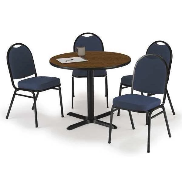 Durable and Economical Hospitality Furniture – Table & 4 chair set. The 42" Round table is 1.25" thick with a High Pressure Laminate surface and T-Mold edge. The base is made of durable cast iron. The column is 16 Gauge steel with a 3" diameter. Leveling glides for stability on uneven floors. The chairs are made with a 2" Cushioned seat for lasting comfort. Upholstered in durable fabric. The frame is 13/16" Steel, with black powder-coat finish. Chairs have side stacking bars and rear leg bar for stability. Stacks 12 high. Overall chair dimensions are 17.5" W x 22" D x 36" H. Tables shipped unassembled. Chairs shipped assembled. CA 117 certified. 12 Year Limited Warranty.