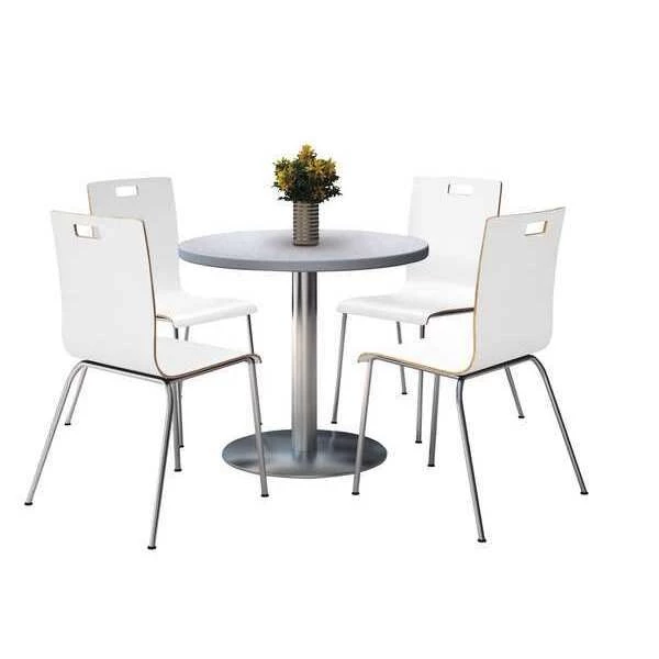 Attractive and Contemporary Breakroom/Cafeteria Furniture – Table & 4 chair set. The 42" Round table is 1.25" thick with a High Pressure Laminate surface and T-Mold edge. The base is made of durable cast iron. The column is 16 Gauge steel with a 3" diameter. Leveling glides for stability on uneven floors. The chair is made of attractive bent wood and has a durable high pressure laminate surface in Natural, Espresso or White. 3/4 inch round chromed steel tube frame-16 gauge. Non-marring polyurethane glides. Hand hold for easy moving and storage. Stacks 5 high. Overall chair dimensions: 20.5" W x 21" D x 34" H. Tables shipped unassembled. Chairs shipped assembled, CAL 117 certified, 12 Year Limited Warranty.