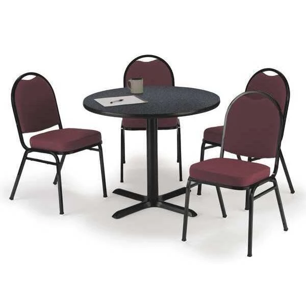 Durable and Economical Hospitality Furniture – Table & 4 chair set. The 36" Round table is 1.25" thick with a High Pressure Laminate surface and T-Mold edge. The base is made of durable cast iron. The column is 16 Gauge steel with a 3" diameter. Leveling glides for stability on uneven floors. The chairs are made with a 2" Cushioned seat for lasting comfort. Upholstered in durable fabric. The frame is 13/16" Steel, with black powder-coat finish. Chairs have side stacking bars and rear leg bar for stability. Stacks 12 high. Overall chair dimensions are 17.5" W x 22" D x 36" H. Tables shipped unassembled. Chairs shipped assembled. CA 117 certified. 12 Year Limited Warranty.