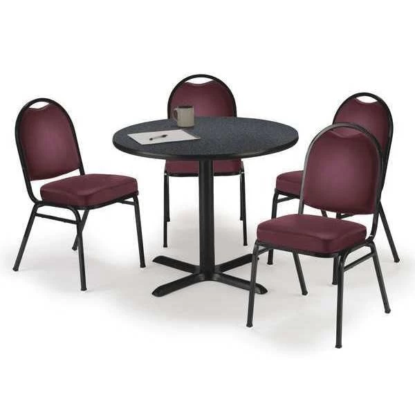 Durable and Economical Hospitality Furniture – Table & 4 chair set. The 42" Round table is 1.25" thick with a High Pressure Laminate surface and T-Mold edge. The base is made of durable cast iron. The column is 16 Gauge steel with a 3" diameter. Leveling glides for stability on uneven floors. The chairs are made with a 2" Cushioned seat for lasting comfort. Upholstered in easy to clean vinyl. The frame is 13/16" Steel, with black powder-coat finish. Chairs have side stacking bars and rear leg bar for stability. Stacks 12 high. Overall chair dimensions are 17.5" W x 22" D x 36" H. Tables shipped unassembled. Chairs shipped assembled. CA 117 certified. 12 Year Limited Warranty.