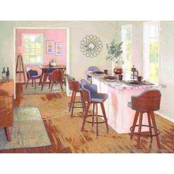 The Mid-Century charm of the Ahoy Counter Stool combines sturdy construction with aesthetic appeal. A walnut wood frame is accented by faux leather upholstery and stylish wood-pressed grain bamboo legs. Available in a variety of color combinations, choose the one that suits your space best!