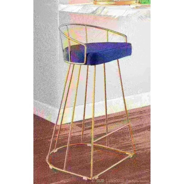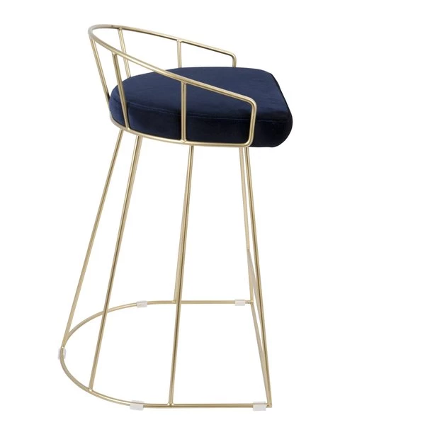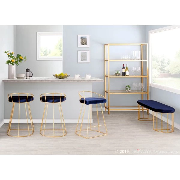Opulent and confidently contemporary – that's the Canary Counter Stool from LumiSource. Features a captivating cage-like gold tone metal base with footrest, subtle curved backrest, and an elegant upholstered seat available in various modern colors. Definitely a bold touch of fancy for your seating needs.