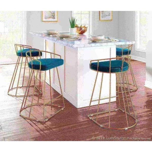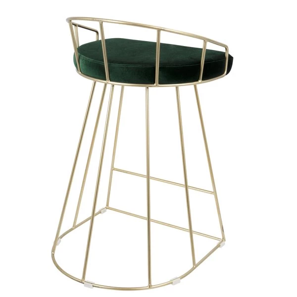 Opulent and confidently contemporary – that's the Canary Counter Stool from LumiSource. Features a captivating cage-like gold tone metal base with footrest, subtle curved backrest, and an elegant upholstered seat available in various modern colors. Definitely a bold touch of fancy for your seating needs.