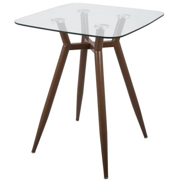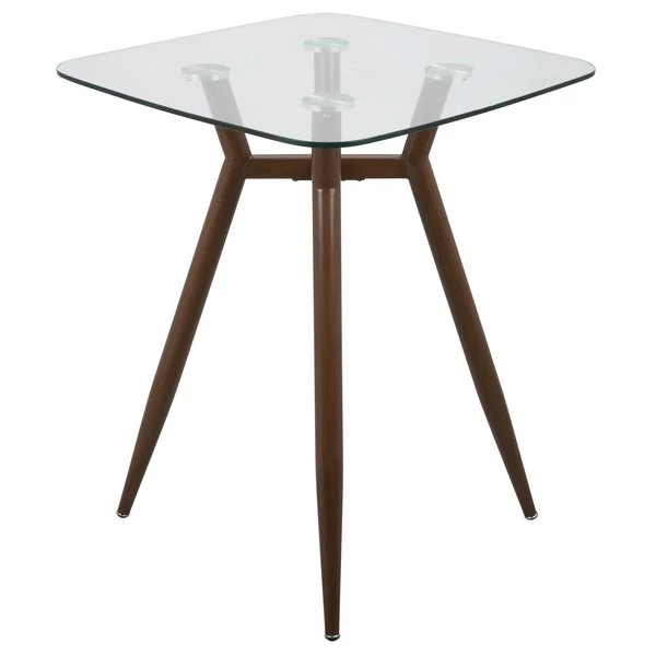 Simplistic and sleek the Clara Counter Table features a geometric metal base, displayed under a clear tempered glass top or a walnut wood top. Available in two leg finishes, choose the one that fits your space best!