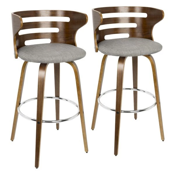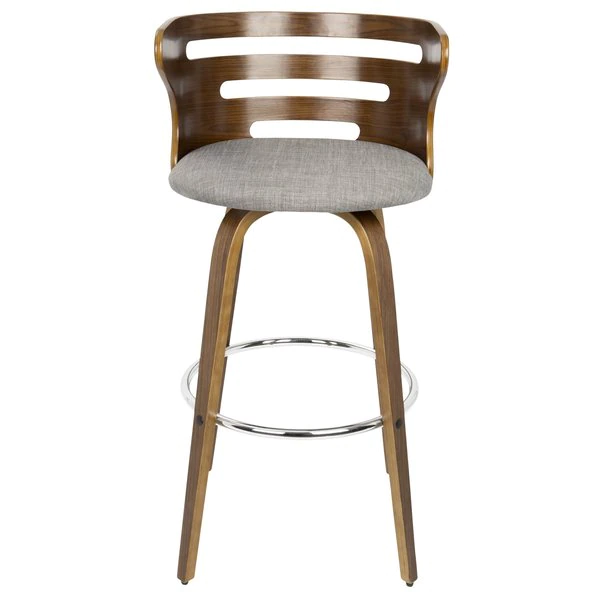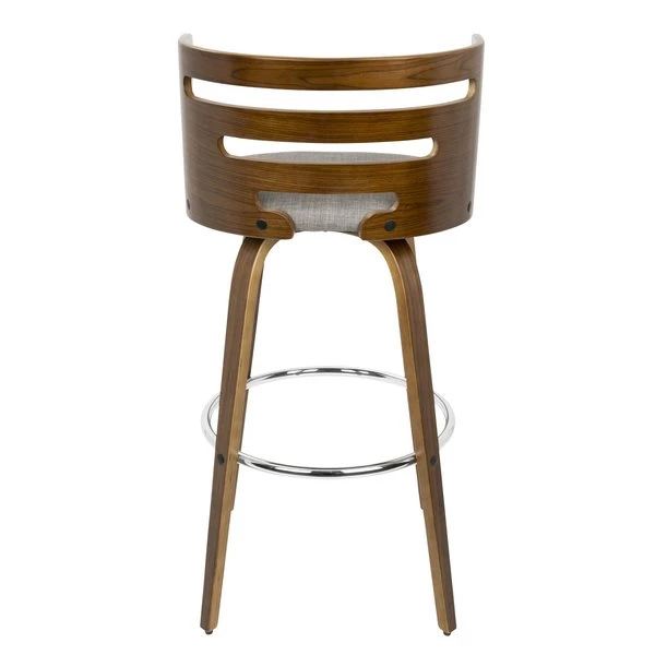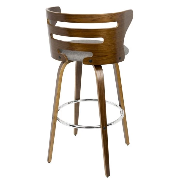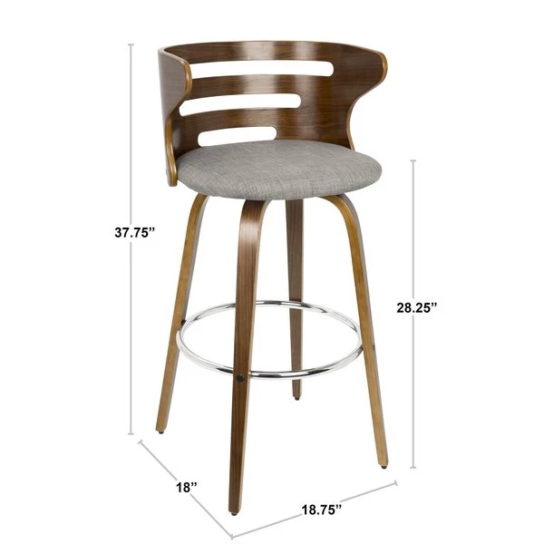 The walnut wood backrest of the LumiSource Cosini Barstool hugs the body with graceful, curved lines. Tapered bent wood legs are joined by a circular chrome footrest for support and durability. Add in a cushioned upholstered seat and the Cosini Barstool becomes go-to seating for any group gathering.