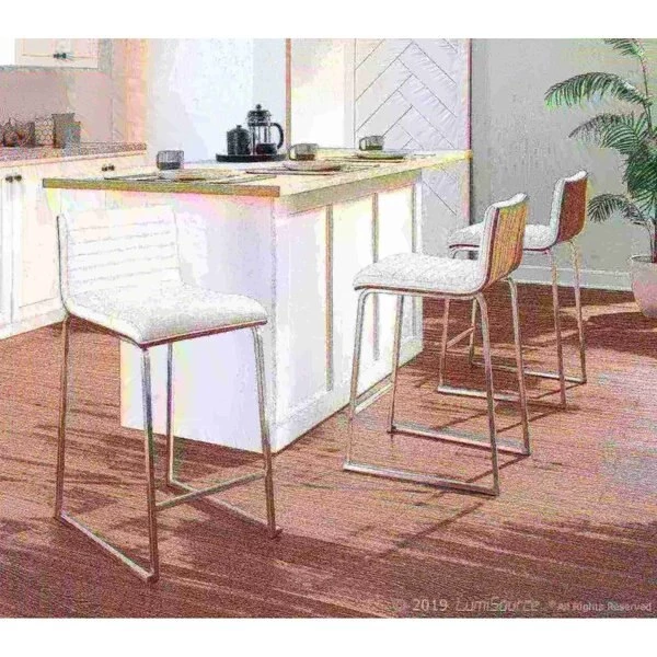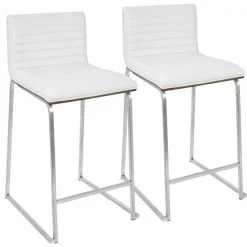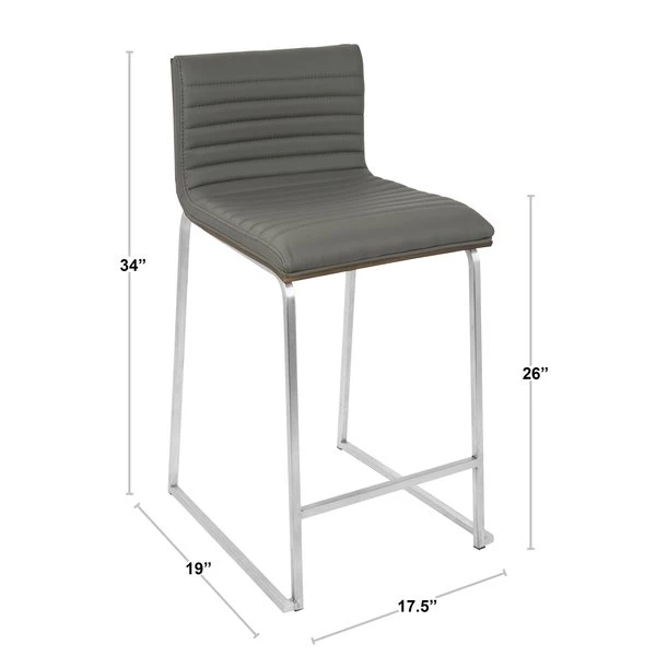 Elegant and modern, the LumiSource Mara Counter Stool has a simple design with gorgeous elements. Featuring a tufted faux leather seat, a solid wood back and graceful stainless steel curved footrest and legs. Great for a kitchen, bar or for extra seating in a break room. This stylish design will fit a variety of decor styles. Sold in sets of two, pick the color that suits your space the best!