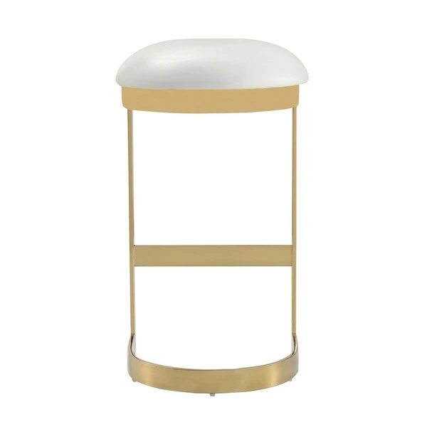 A study in balance. This bar stool is all understated luxury. Featuring a floating frame design with a curved base, its unique modern style creates an undeniable sense of lightness. Smooth Faux Leather upholstery is tailored into a sleek cushioned seat that rests easily on a polished metal base, enhancing its effortless feel. Its chic polished brass finish lends a subtly sumptuous touch that will elevate the atmosphere in any dining space. To complete the look, coordinate with the Aura Dining Chair.