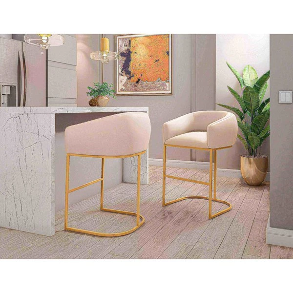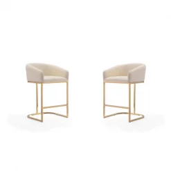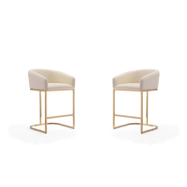 A hint of mid-century modern style that brings the chic and elegant flair to any home's decor. This stool is all kinds of wonderful. A clean-lined, curved, and comfortable seat, sits atop a shimmery gold semi-circle pedestal base. A metal footrest finishes the look, bringing added comfort to the leather-upholstered piece. Gorgeously well-served, in a perfect neutral tone for that touch of warm texture.