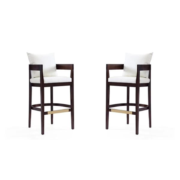 Standing on solid wood legs, this stool's wide cushioned seat and back, offers comfort and a clean-lined aesthetic to kitchen islands and bar tops. Accented with a gold finished footrest, casual comfort meets sleek and chic modern design to update or accent your home's upscale decor.