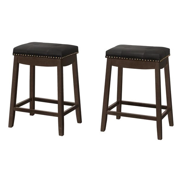 Traditional design details give these barstools a timeless style. Upholstered in a black leather-look fabric, the rectangular seats feature thick cushions with biscuit tufting that enhances the soft feel of the padding. Nailhead trim in a brass finish around the seats and curved aprons underneath further add to the classic, pub-like appeal of these counter-height chairs. Solid wood legs provide stability and are in a rich, dark-brown espresso finish, while footrests are ideally positioned to relax your feet. Sold as a set of 2, these stools have a space-saving, backless design that allows them to be tucked neatly underneath a kitchen island or counter-height table when not in use.