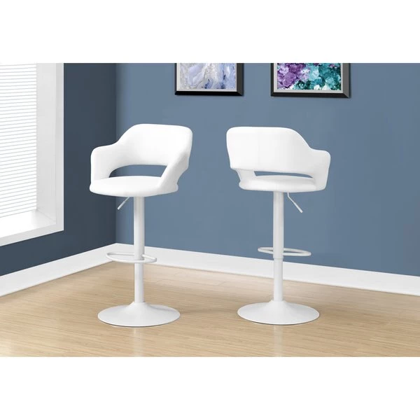 Against the home bar or counter, this bar chair will be the perfect spot for weekday breakfasts, tasty Sunday brunches or get togethers with friends and family. With an ergonomic curved seat back design, the white leather look seat has sufficient padding and a footrest on the matching white metal base for extra comfort. Adjust the seat from 25 to 30 inches with the hydraulic lift mechanism, or swivel the chair's pedestal base 360 degrees. Perfect for hosting a group of friends or family in your kitchen, games room or elsewhere, this bar stool is as stylish as it gets. Includes 1 bar chair.. Against the home bar or counter, this counter height bar stool will be the new favorite seating spot every day of the week. Solid pedestal base in a smooth white metal finish. Super comfortable leather look fabric in white ; the cross brace can be used as a footrest. Full 360 degree swivel stool features an adjustable hydraulic lift that allows you to raise the saddle stool from 25 to 30 inches. Product Dimensions: 23 Inch L x 21 Inch W x 42 Inch Maximum H