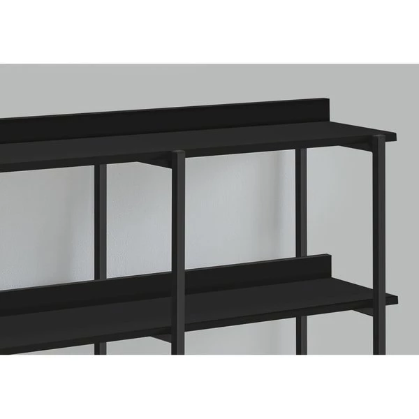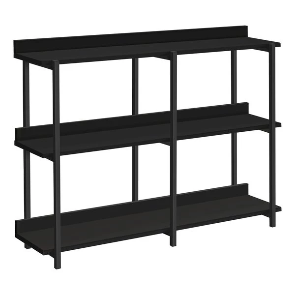 Proudly display prized possessions on this rectangular console table with 3-tier shelving. Underneath the long, narrow tabletop are shelves arranged on 2 levels. Distribute books, plants, and decorative items among the tabletop and shelves, which are in a black laminate finish. The sturdy metal frame as well in black finish features clean lines and right angles for a modern look. With its narrow profile and generous display space, this versatile accent table with storage is ideal for a hallway, an entryway, or behind a sofa in a living room._x000D_