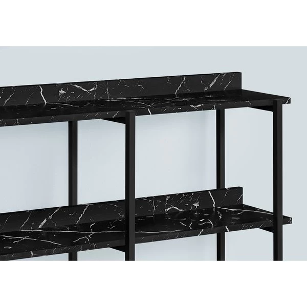 Proudly display prized possessions on this rectangular console table with 3-tier shelving. Underneath the long, narrow tabletop are shelves arranged on 2 levels. Distribute books, plants, and decorative items among the tabletop and shelves, which are in a elegant black marble-look laminate finish. The sturdy metal frame in black finish features clean lines and right angles for a modern look. With its narrow profile and generous display space, this versatile accent table with storage is ideal for a hallway, an entryway, or behind a sofa in a living room._x000D_