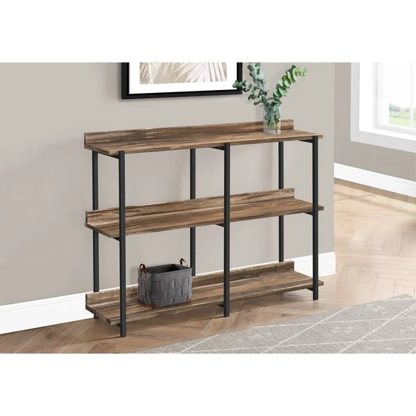 Proudly display prized possessions on this rectangular console table with 3-tier shelving. Underneath the long, narrow tabletop are shelves arranged on 2 levels. Distribute books, plants, and decorative items among the tabletop and shelves, which are in a medium brown reclaimed wood-look finish. The sturdy metal frame in a contrasting black finish features clean lines and right angles for a modern look. With its narrow profile and generous display space, this versatile accent table with storage is ideal for a hallway, an entryway, or behind a sofa in a living room.