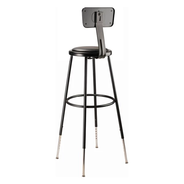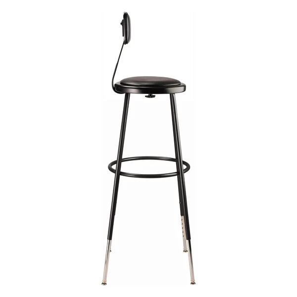 The fortified construction and soft comfort of the black 6400 Series heavy-duty padded stools with backrests are ideal for hands-on educational settings like art rooms, science labs, home economics or shop classrooms. These reliable stools feature a sturdy frame of 18-gauge steel tubing securely welded to a 14 inch diameter seat pan. Riveted through the steel pan are .5 inch -thick black vinyl cushioning that will provide years of dependable use. Footrest ring is securely bonded to each leg with four spotwell contact points. Height-adjustable legs extend from 32 inches to 39 inch in 1-inch increments and adjustable padded backrests can be moved 2 inches up/down and forward/back.