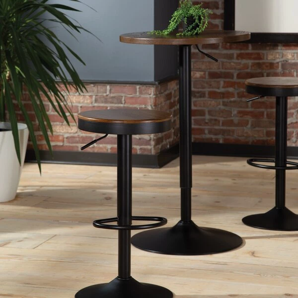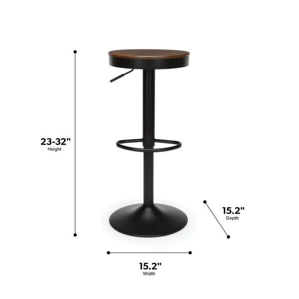 The 161 Collection blends mid century modern and industrial modern styles with current design trends to create timeless pieces that will seamlessly complement any decor. The OFM 161 Collection Industrial Modern Backless 23" to 32" Adjustable Bar Stool, 2 pack, is the quintessential industrial modern accent where wood meets metal in a minimalist form. This pneumatically adjustable height stool adjusts from 23" high to 32" high to accommodate a wide range of users. The adjustment handle is easy to access beneath the seat. The welded foot rest features a seat-to-footrest span of 16" for the optimal comfort distance. The bar stool features a trumpet base that provides sturdy support, features a plastic ring that helps prevent sliding and scratching, and is easily assembled in 5 minutes. The stool base features a matte Black finish that is paired with a Walnut finish for the wooden seat. The stool holds 250 lb and measures 15.2 D x 15.2 W x 23-32 H. With a 5 Year Limited Warranty and testing to light commercial-grade standards, this bar stool provides the functionality you need without the fuss.