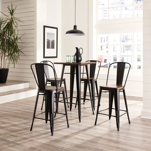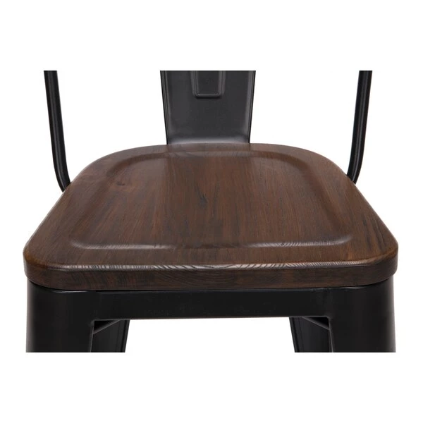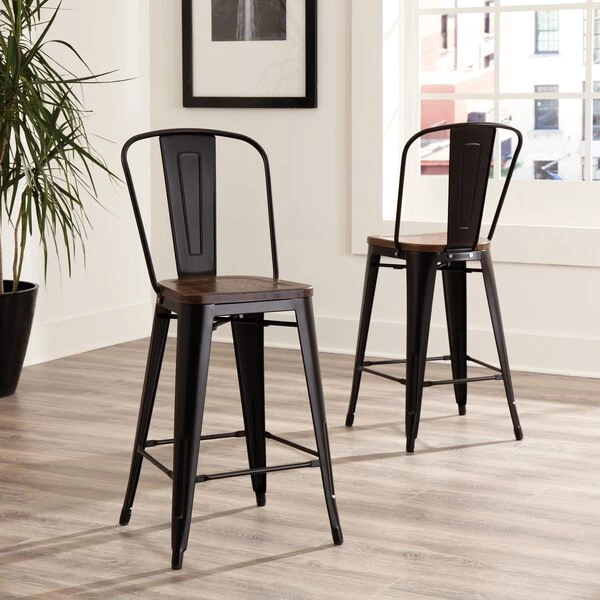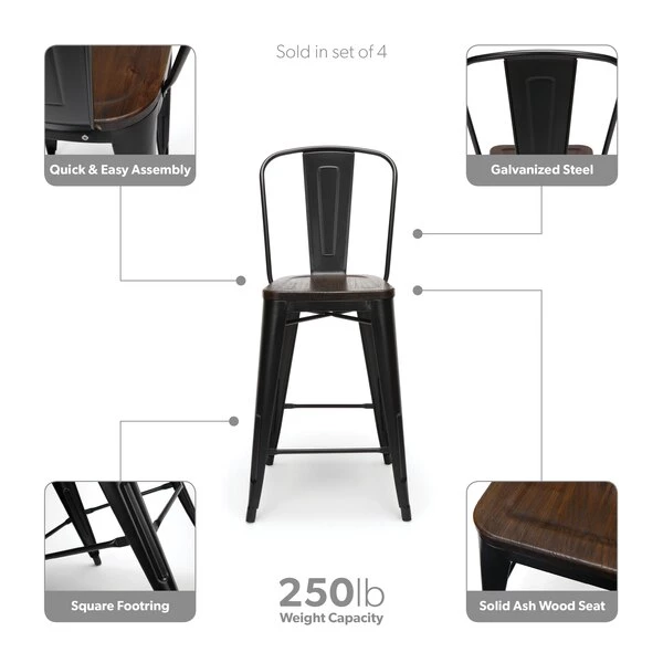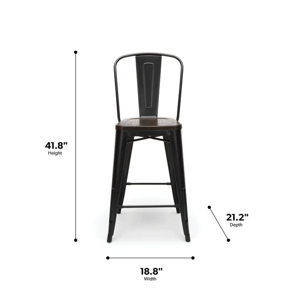 The 161 Collection blends mid century modern and industrial modern styles with current design trends to create timeless pieces that will seamlessly complement any decor. The OFM 161 Collection Industrial Modern 26" High Back Metal Stools with Solid Ash Wood Seats, 4 Pack, bring the industrial vibe of a galvanized steel frame and couple it with the inviting warmth of stained ash wood to deliver a stool comfortable beneath an outside awning or pulled up to your kitchen island. These metal stools are quick and easy to assemble, only 4 screws needed! Added stability and strength are provided by the square foot ring and the x-brace beneath the seat. These high back counter height stools are perfect for kitchens, patios, cafes, pubs, bistros, and restaurants because they are easy to clean and feature plastic non-marring floor glides that help prevent sliding and scratching. An anti-UV powder coats the stools to prevent heat retention, making these chairs comfortable even in full sun. These bar stools hold at least 250 lb and measure 18.8" W x 21.2" D x 41.8" H. Backed by light commercial-grade standards testing and a 5 Year Limited Warranty, these stools deliver comfort and confidence.