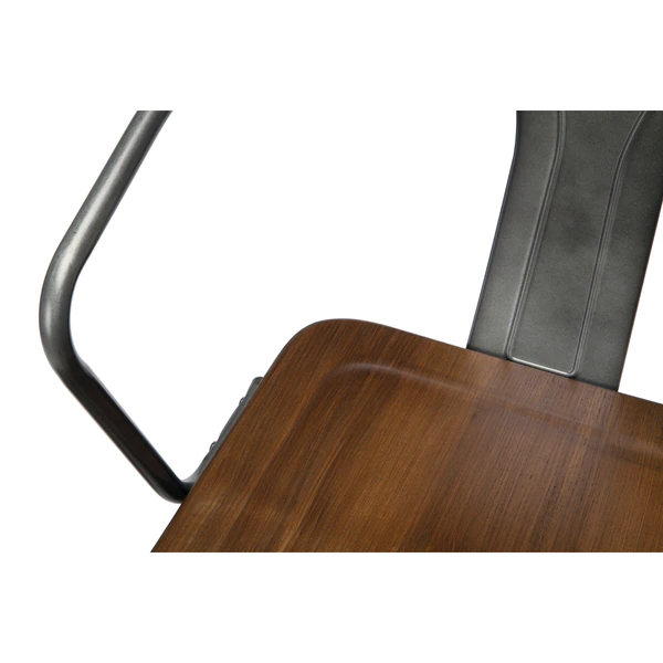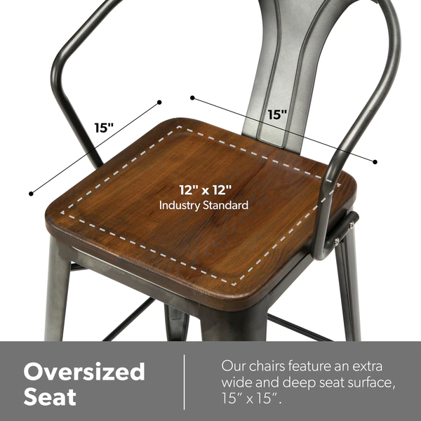The 161 Collection blends mid century modern and industrial modern styles with current design trends to create timeless pieces that will seamlessly complement any decor. The OFM 161 Collection Industrial Modern 26" Mid Back Metal Stools with Arms and Solid Ash Wood Seats, 4 Pack, bring the industrial vibe of a galvanized steel frame with the cozy comfort of arms and couple it with the inviting warmth of stained ash wood to deliver an armchair stool comfortable beneath an outside awning or pulled up to your kitchen island. These metal stools have an extra wide seat and are quick and easy to assemble, only 6 screws needed! Added stability and strength are provided by the square foot ring and the x-brace beneath the seat. These mid back counter height stools are perfect for kitchens, patios, cafes, pubs, bistros, and restaurants because they are easy to clean and feature plastic non-marring floor glides that help prevent sliding and scratching. An anti-UV powder coats the stools to prevent heat retention, making these chairs comfortable even in full sun. These bar stools hold at least 250 lb and measure 20.3" W x 22.5" D x 40" H. Backed by light commercial-grade standards testing and a 5 Year Limited Warranty, these stools deliver comfort and confidence.