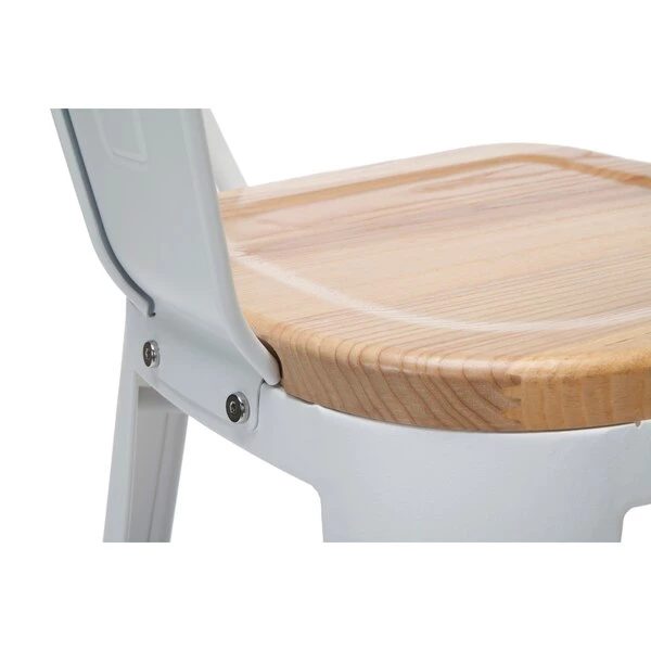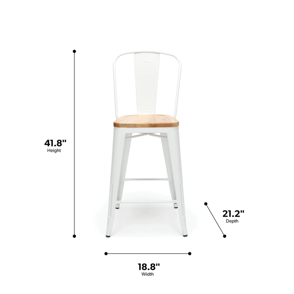 The 161 Collection blends mid century modern and industrial modern styles with current design trends to create timeless pieces that will seamlessly complement any decor. The OFM 161 Collection Industrial Modern 26" High Back Metal Stools with Solid Ash Wood Seats, 4 Pack, bring the industrial vibe of a galvanized steel frame and couple it with the inviting warmth of stained ash wood to deliver a stool comfortable beneath an outside awning or pulled up to your kitchen island. These metal stools are quick and easy to assemble, only 4 screws needed! Added stability and strength are provided by the square foot ring and the x-brace beneath the seat. These high back counter height stools are perfect for kitchens, patios, cafes, pubs, bistros, and restaurants because they are easy to clean and feature plastic non-marring floor glides that help prevent sliding and scratching. An anti-UV powder coats the stools to prevent heat retention, making these chairs comfortable even in full sun. These bar stools hold at least 250 lb and measure 18.8" W x 21.2" D x 41.8" H. Backed by light commercial-grade standards testing and a 5 Year Limited Warranty, these stools deliver comfort and confidence.