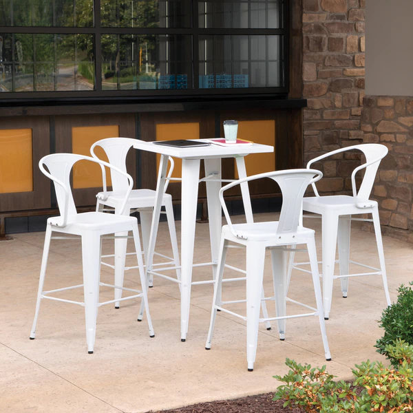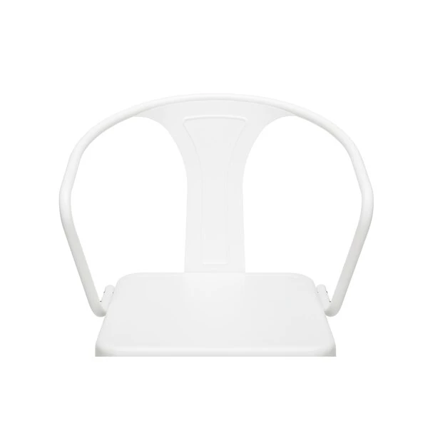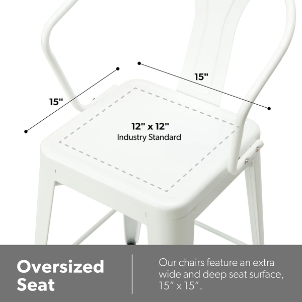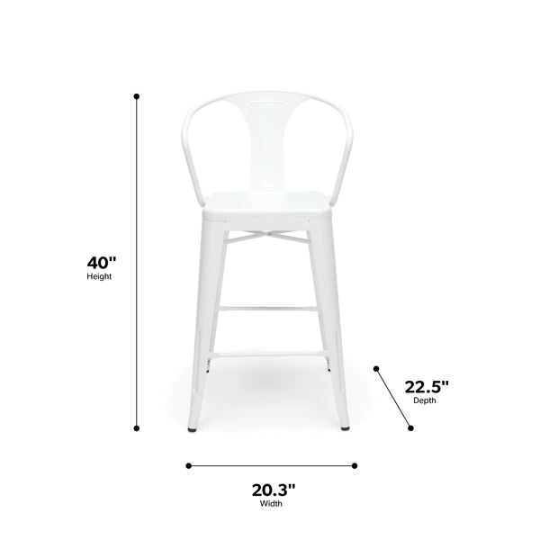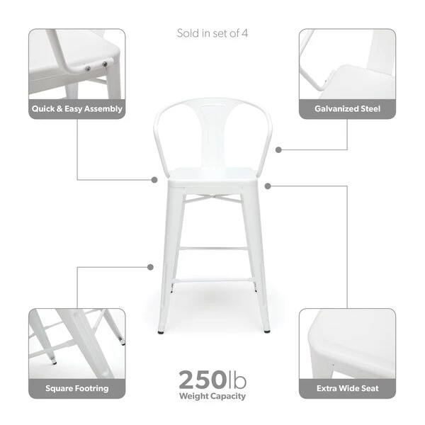 The 161 Collection blends mid century modern and industrial modern styles with current design trends to create timeless pieces that will seamlessly complement any decor. The OFM 161 Collection Industrial Modern 26" Mid Back Metal Arm Chair Stools, 4 Pack, provide a comfortable, yet sophisticated, counter height seating solution for cafe tables and bars, suitable for indoor or outdoor settings. These metal stools have an extra wide seat and are quick and easy to assemble with just 6 screws needed. The squared foot ring provides added stability and a place to rest your feet. These stools are prepared to decorate any outdoor location with their galvanized steel construction and anti-UV powder coating that helps prevent heat retention. These matte White metal chairs are easy to clean with a simple damp cloth. The bar stools feature an x-brace, beneath the seat, that provides additional support and stability, hold at least 250 lb, and measure 20.3" W x 22.5" D x 40" H. The bistro stools have plastic, non-marring protective floor glides to protect flooring and prevent sliding. These stools have been tested to light commercial-grade standards and are covered by our 5 Year Limited Warranty.