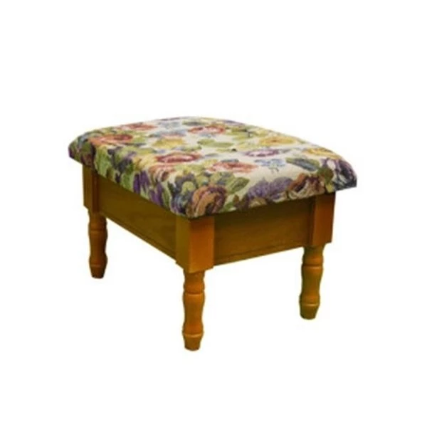 A small convenient storage stool for the living room and den that adds style and utility. Place an assortment of items for storage and convenience in this stool.FeaturesAdd Style to Any Room with this Elegant Foot Rest in Oak Finish.Victorian Floral Print Padded Cover.Wood and wood composite with a warm oak finish.Top lifts to convenient storage.Dimensions – 18 x 14 x 7 in.