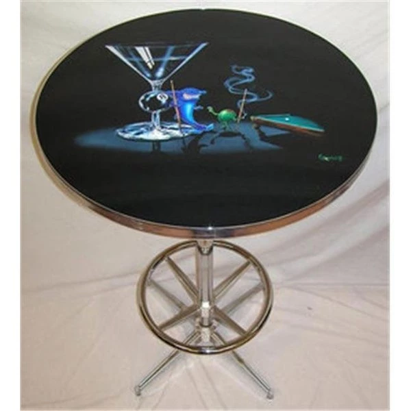 This Michael Godard artwork logo billiard pub table will add ambiance and an exciting atmosphere to any home bar or billiard room. Godard artwork is viewed by thousands everyday at museums. art galleries. casinos. cruiseliners. and more. Now you can have your very own Godard artwork billiard pub table for your home billiard room. bar. or activity area. Also a great gift idea for any billiard or pub enthusiast.Scratch resistant treated acrylic table top. Godard logo reverse printed on underside to protect art. Metal chrome plated finish. Chrome plated footrest at base. 28" diameter table top. 42" base height.Table top and table base shipped in separate boxes. Base requires partial assembly and needs to be assembled to table top.Pool Shark Pub Table.