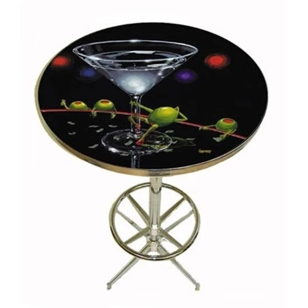 This Michael Godard artwork logo billiard pub table will add ambiance and an exciting atmosphere to any home bar or billiard room. Godard artwork is viewed by thousands everyday at museums. art galleries. casinos. cruiseliners. and more. Now you can have your very own Godard artwork billiard pub table for your home billiard room. bar. or activity area. Also a great gift idea for any billiard or pub enthusiast.Scratch resistant treated acrylic table top. Godard logo reverse printed on underside to protect art. Metal chrome plated finish. Chrome plated footrest at base. 28" diameter table top. 42" base height.Table top and table base shipped in separate boxes. Base requires partial assembly and needs to be assembled to table top.Dirty Martini Pub Table.