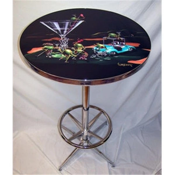 This Michael Godard artwork logo billiard pub table will add ambiance and an exciting atmosphere to any home bar or billiard room. Godard artwork is viewed by thousands everyday at museums. art galleries. casinos. cruiseliners. and more. Now you can have your very own Godard artwork billiard pub table for your home billiard room. bar. or activity area. Also a great gift idea for any billiard or pub enthusiast.Scratch resistant treated acrylic table top. Godard logo reverse printed on underside to protect art. Metal chrome plated finish. Chrome plated footrest at base. 28" diameter table top. 42" base height.Table top and table base shipped in separate boxes. Base requires partial assembly and needs to be assembled to table top.19Th Hole Pub Table.