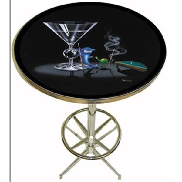 This Michael Godard artwork logo billiard pub table will add ambiance and an exciting atmosphere to any home bar or billiard room. Godard artwork is viewed by thousands everyday at museums. art galleries. casinos. cruiseliners. and more. Now you can have your very own Godard artwork billiard pub table for your home billiard room. bar. or activity area. Also a great gift idea for any billiard or pub enthusiast.Scratch resistant treated acrylic table top. Godard logo reverse printed on underside to protect art. Metal chrome plated finish. Chrome plated footrest at base. 28" diameter table top. 42" base height.Table top and table base shipped in separate boxes. Base requires partial assembly and needs to be assembled to table top.Pool Shark III Pub Table.