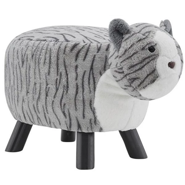 Add a smile to any room in your house with this playful tabby cat stool. Featuring a cute face. perky ears. soft furry body and floppy tail. this stool is sure to be loved by children and adults alike. Perfectly suited for your young ones. this cute stool lets them kick up their feet or simply have a seat. The sturdy wood frame is cushioned and wrapped in faux fur. Easy to assemble by simply screwing on the legs. FeaturesSolid wood frame and legsCushioned stoolCovered with soft faux furCute cat features including ears and tailCan be used as an accent piece. child's stool or ottomanSpecificationsDimension: 24 x 13.5 x 15 in.Seat: 19"W x 13.25"D x 14.5"HWeight: 9.02 lbs