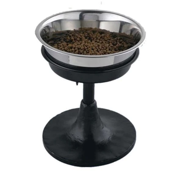 Raising the bar on quality dog feeders QT Dog has done it again – the Adjustable Barstool Dog Feeder can be raised from twelve to eighteen inches so dogs large and small can dine comfortably. A non-tip base makes it safe for any room. Like your favorite seat at the neighborhood pub this dog feeder will become your dogs preferred spot a dependable place to enjoy a good meal and good company.QT Dogs raised feeders limit the amount of that dogs take in while feeding thereby reducing bloating and gas and promoting healthy digestion. They are also make the dining experience more comfortable for older dogs with hip and back problems.Features:Black hand-forged ironBlack durable powder coat finishNon-tip baseIncludes 3 qt stainless steel bowlAdjusts from 12" – 18" high