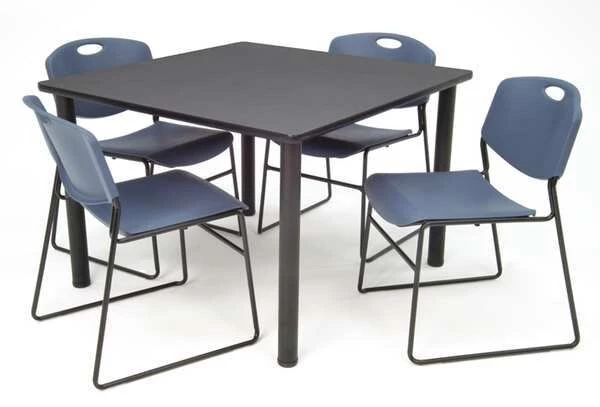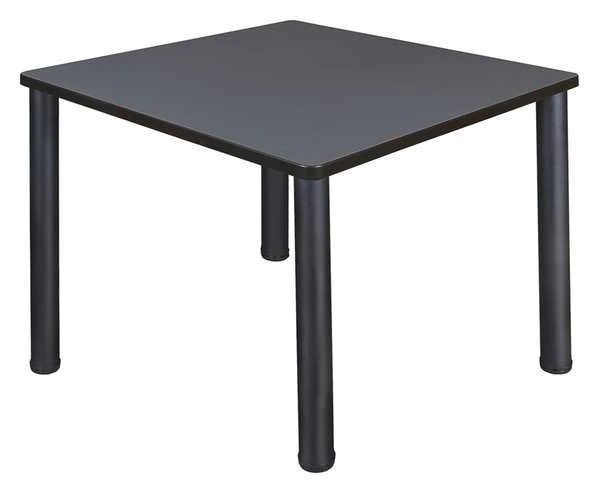 Cafe Table, Surface Material Laminated Melamine, Shape Square, Width 36 in, Depth 36 in, Height 30 in, Tabletop Color Family Gray, Tabletop Color Dark Gray Nebula, Assembled/Unassembled Unassembled, Edge Type T-Molded, Edge Color Black, Base Type (4) Tubular Steel Legs, Leg Type Straight, Top Thickness 1 in, Load Rating 100 lb, Series Kee, Includes (4) Leveling Glides