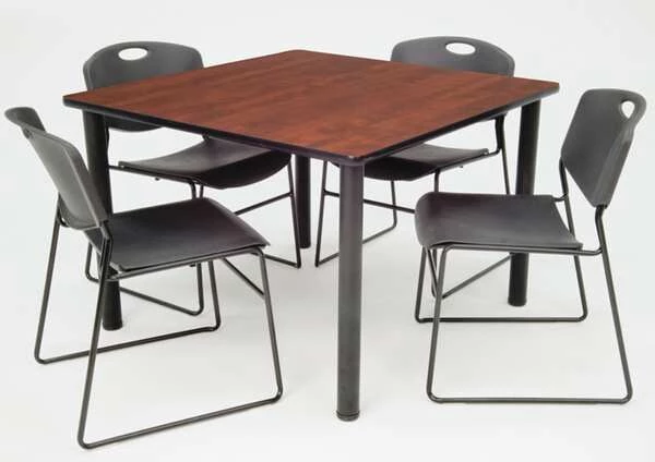 Cafe Table, Surface Material Laminated Melamine, Shape Square, Width 36 in, Depth 36 in, Height 30 in, Tabletop Color Family Woodgrain, Tabletop Color Cherry, Assembled/Unassembled Unassembled, Edge Type T-Molded, Edge Color Black, Base Type (4) Tubular Steel Legs, Leg Type Straight, Top Thickness 1 in, Load Rating 100 lb, Series Kee, Includes (4) Leveling Glides