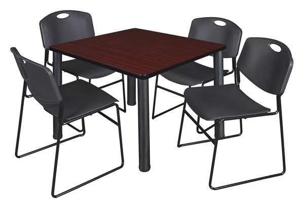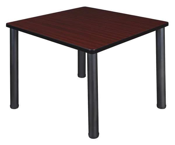 Cafe Table, Surface Material Laminated Melamine, Shape Square, Width 42 in, Depth 42 in, Height 30 in, Tabletop Color Family Woodgrain, Tabletop Color Mahogany, Assembled/Unassembled Unassembled, Edge Type T-Molded, Edge Color Black, Base Type (4) Tubular Steel Legs, Leg Type Straight, Top Thickness 1 in, Load Rating 100 lb, Series Kee, Includes (4) Leveling Glides