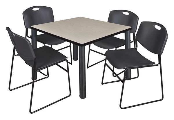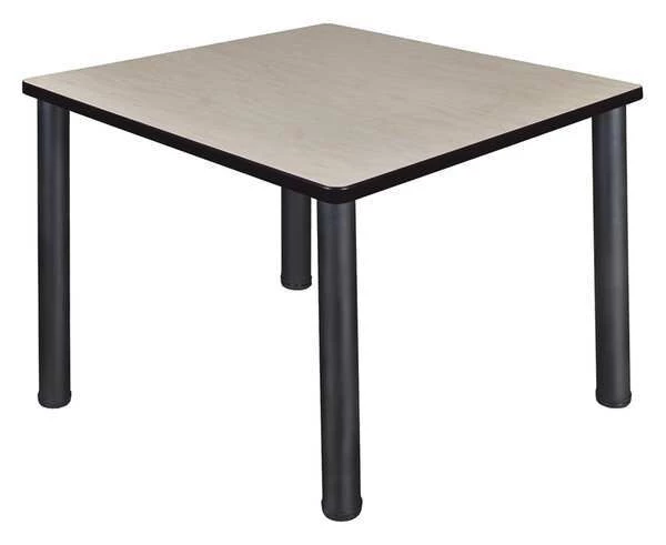 Cafe Table, Surface Material Laminated Melamine, Shape Square, Width 42 in, Depth 42 in, Height 30 in, Tabletop Color Family Woodgrain, Tabletop Color Maple, Assembled/Unassembled Unassembled, Edge Type T-Molded, Edge Color Black, Base Type (4) Tubular Steel Legs, Leg Type Straight, Top Thickness 1 in, Load Rating 100 lb, Series Kee, Includes (4) Leveling Glides
