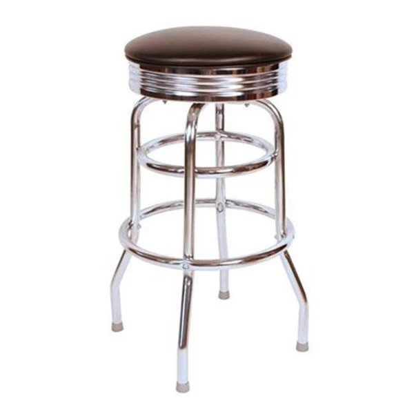 Upholstered round 360 degree swivel seat with gleaming chrome pan base. Sturdy. bolted double-ring construction. Commercial grade and made in the USA. Perfect addition to any bar. restaurant. service counter. cafe or home. 18" gauge steel frame with 1" outer tube thickness in chrome finish. Gray nylon floor glides. Available in 30" bar height only Richardson Seating's Floridian collection offers 6 vinyl fabric finishes and ships within 3-5 business days as quick ship items. The 50's retro look bar stool collection is back with added comfort and stylish design. The Floridian collection are commercial bar stools made in the USA. and equally ideal for residential use.Materials: Steel. metal. vinyl. foam. fiberboard. woodDimensions: Length: 16.75"Width: 16.75"Height: 30"Seat Dimensions: 30"Style: Retro