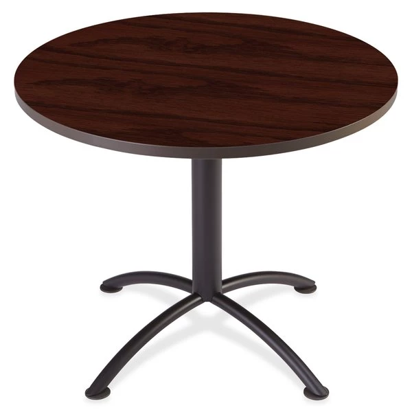 Cafe Table, Surface Material Laminated Melamine, Shape Round, Diameter 36 in, Height 30 in, Tabletop Color Family Woodgrain, Tabletop Color Mahogany, Frame Color Charcoal, Assembled/Unassembled Unassembled, Frame Material Steel, Edge Type Banded, Edge Color Gray, Base Type (4) Legs Attached to Pedestal, Leg Type Arched, Top Thickness 1 1/8 in, Load Rating 250 lb, Series iLand, Includes (4) Leveling Glides