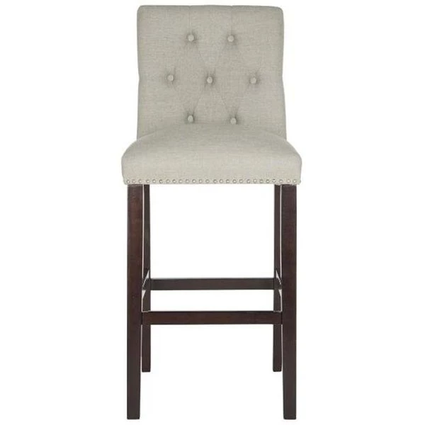 Elevate the taste level in any room with these posh modern barstools . Their plush. tufted light upholstery and sturdy espresso legs make them ideal for savoring petit dejeuner in the morning or a glass of wine after the sun goes down. In the past few decades Safavieh has come a long way with ssophisticated operations. We've always been considered on fine quality. craftsmanship and style. We have continued to meet the unique needs of our clientele by providing only the highest quality product. It is always our pleasure to serve you. Our services are tailored to earn your trust and loyalty. Our products are tailored to earn your trust and loyalty. FeaturesSet of 2SpecificationsColor: Light GreyWood Color: EspressoWood Content: RubberwoodUpholstery Content: LinenMetal Color: Silver NailheadsCollection Name: SafaviehAssembly Required: YesDimensions: 44" H x 20" W x 19" DWeight: 33 lbs