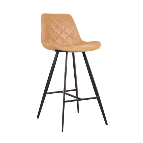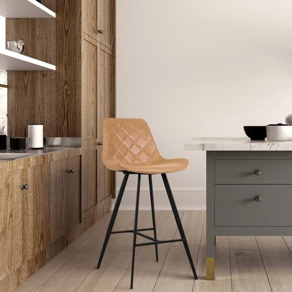 Gift yourself a set of sophisticated modern barstools, supported by striking black conical legs, and thoughtfully upholstered in cruelty free faux leather in calming nostalgic tones. Each chair is strategically designed to give the body ample support while not compromising on style. Barstools sport diamond stitching for a vintage touch and convenient foot rests making them perfect for your home bar or kitchen.