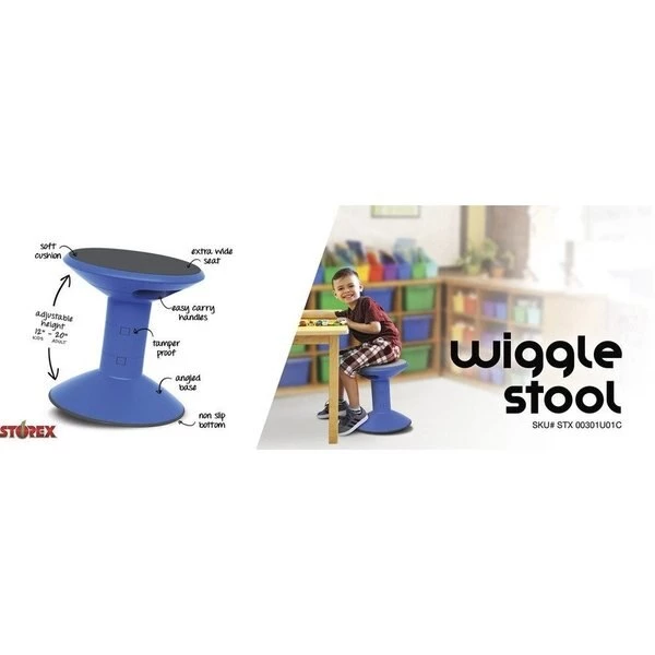 Versatile Wiggle Stool gives you the freedom to move while you sit. Soft, extra-thick cushion provides comfort and support for all-day use. Integrated handles allow easy carrying, even for smaller children. Seat height adjusts between 12" and 18". Selectable heights include 12", 14", 16" or 18". Tamperproof height adjustment prevents distractions. Base is angled for improved posture, balance and stability. Rubberized, nonslip base provides increased stability even when tipped over. No-spin base aids focus and promotes a distraction-free environment.