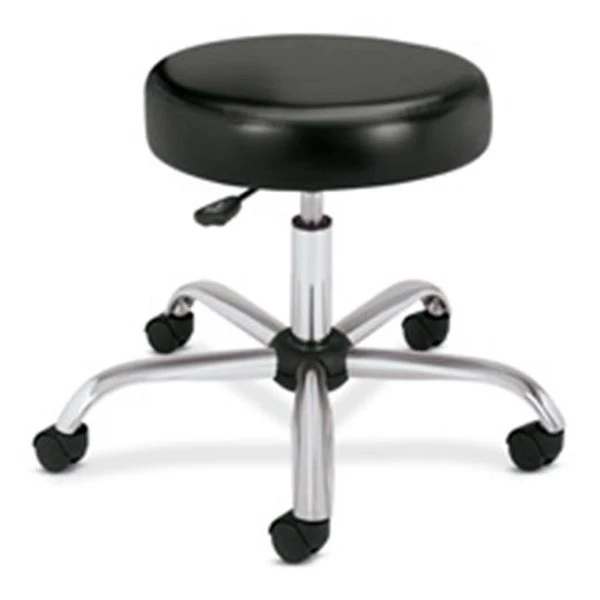 Medical exam stool features a polished base and antimicrobial vinyl covering. Functions include 360-degree swivel and pneumatic seat-height adjustment. 24" diameter five-star base features polished chrome and dual wheel. hooded 2" casters. Stool offers a versatile solution for medical examination rooms. a nurse's office or file rooms.