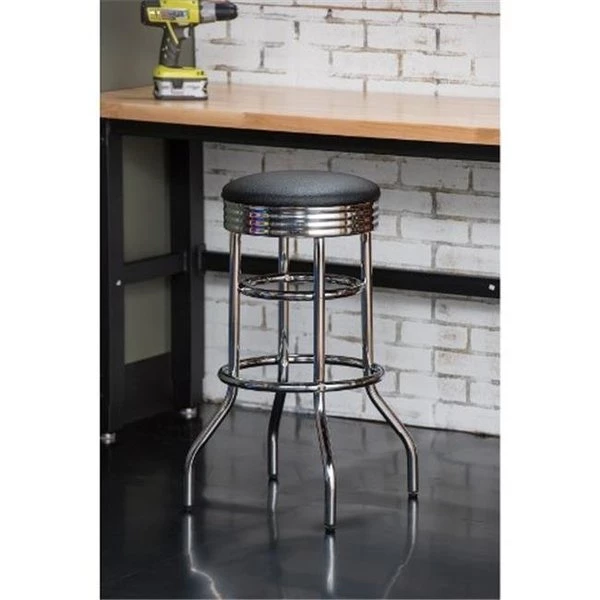 Trinity heavy-duty chrome swivel stool is built to provide both comfort and function. Its sturdy double ring construction and stylish high gloss chrome finish make it perfect for any environment. Feet levelers ensure that your stool is level on any surface. FeaturesHigh gloss chrome finishReinforced steel seat ring for cushion durability15" diameter padded cushion for comfort360 degree swivel seatCA flame retardantDouble ring construction for strength and stabilityIncludes feet levelers to ensure stability and even weight distributionSpecificationsColor: BlackDimension: 30" H x 15.5" W x 15.5" LWeight: 14 lbs