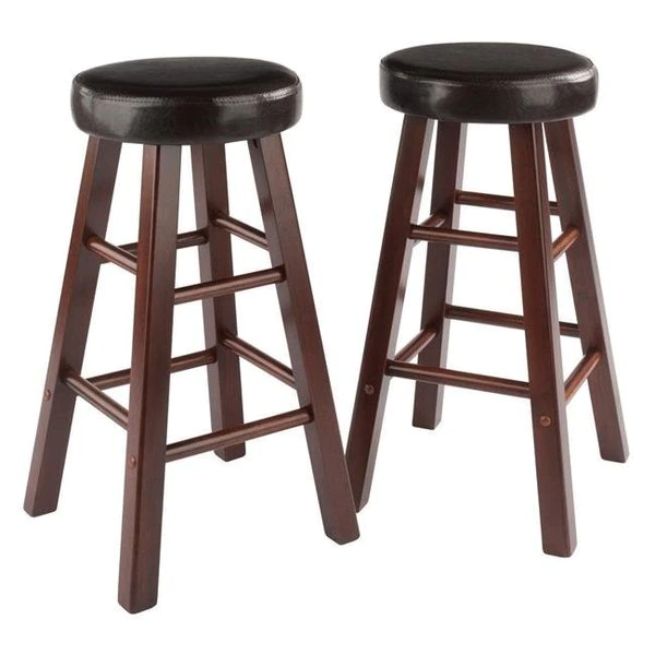 Linger over dinner or work at your home desk in total comfort with the Maria 2-PC Counter Stool Set. The stools have a 2.76" thick cushion seat covered in faux leather. providing maximum comfort for your seating. The frame is made of Solid Wood in a rich Walnut finish that complements the Espresso faux leather. a subtle and handsome combination that will suit any decor from modern to rustic cottage. The construction boasts squared legs with 8 crossbars which give stability and strength while also serving as convenient footrests. With round 12.2" seats. use the set at a counter height table. for extra seating when guests arrive. or at work in your home office. FeaturesThick cushion seat in Espresso faux leatherFrame is Solid Wood. finished in Walnut2 Sets of 4 crossbars2 PieceSpecificationsColor: Espresso & WalnutSeat height: 25.5 in.Seat diameter: 12.2 in.Leg footprint: 13.3 in.Dimensions: 13.39 x 13.39 x 25.59 in.Weight: 19 lbs